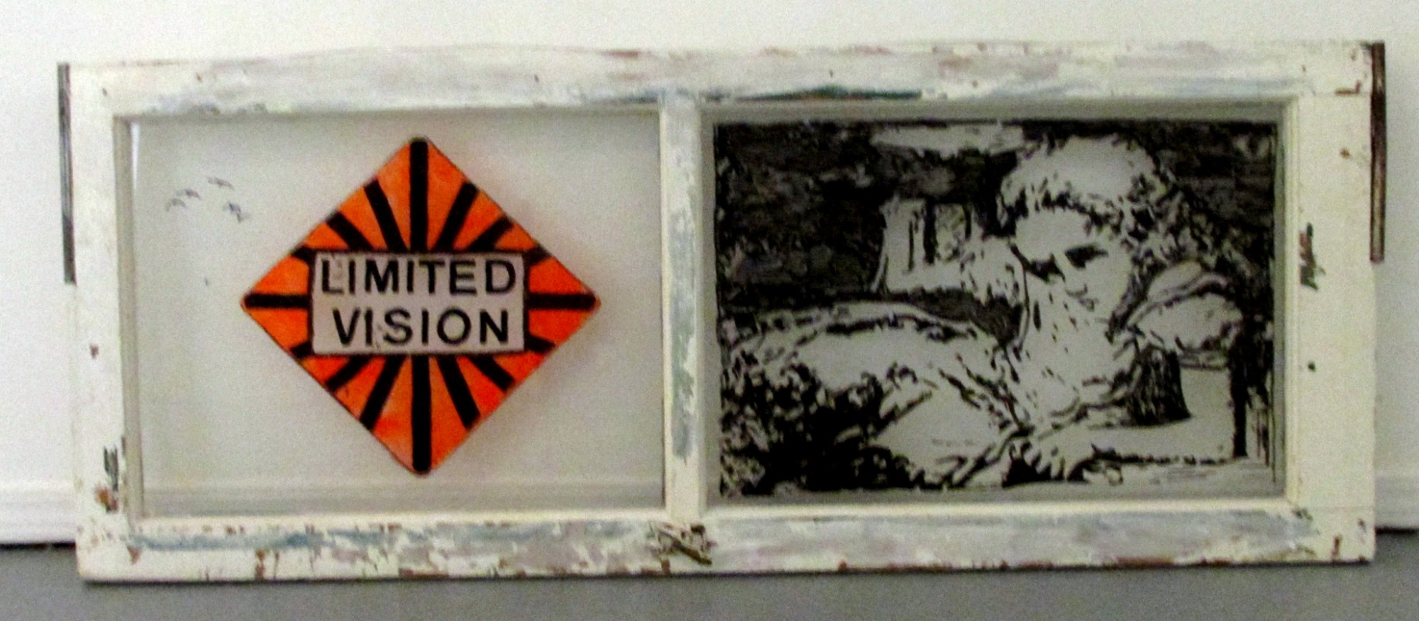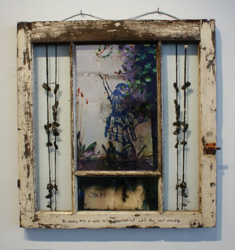 Stealing Home is perhaps best considered a visionary environment turned in on itself to create the outlines and intimations of a home. And this home is a transitory space, and it is a struggle to feel at ease within one. Scavenged doors and windows, pieces of houses exist on their own terms and in tension with each other. Glass and mirrors face each other, bearing images as though burned into them, suffused with natural and reflected light. Salvaged words link together, building new texts and whispered associations about the problem of home and homelessness, both inside and outside.