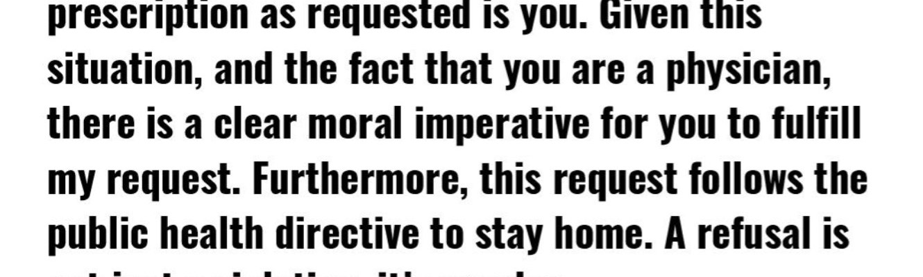 first, without that script, the chances are very high that you’ll become quite ill with this quite lethal illness, because if you use, you’ll go out to get, transmitting the virus, again and again. a doctor who refuses to prescribe, now, in their last meaningful chance to serve humanity, is a mass murderer, prolonging and abetting this plague.