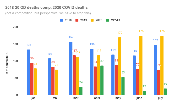 july was the third month in a row when there were 170+ Illicit Drug Toxicity Deaths -> using “illicit” to mean that they *socially* not permitted, so people use alone – and not just illegal. different. and toxicity -> poisoned, not overdose. because you use what you use but there’s not way of knowing this.