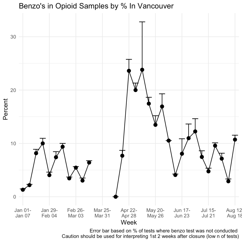 Oh here’s a chart of the % of benzo content in the local down, week by week, since january.