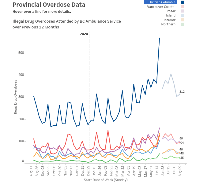 “The number of people dying in B.C. due to an unsafe drug supply continues to surpass deaths due to homicides, motor vehicle incidents, suicides and COVID-19 combined,” said Lisa Lapointe, chief coroner.
