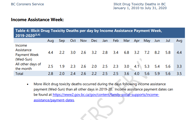 the next part of the coroner’s report is on the day/week when the most overdose events occur. let’s talk about what to do about cheque week.this chart is of deaths per day for the province – cheque day is the same day everywhere, but the supply is local. or in transit, from one market to others. as you can see, cheque day seems to be starting to look like other days by the end of 2019 – or was it?