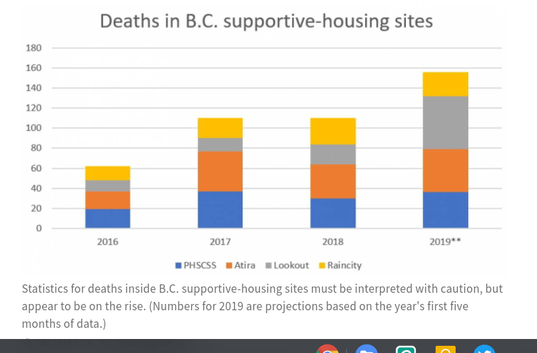 so, there were DOUBLE the % of overdose deaths in supportive, social, SRO, and hotels, shelters etc in the VCH region than province-wide! Doesn’t that seem like something that could be directly addressed? Instead, operators lie to the public and to funders about “community” and “looking out for one another” and meanwhile abuse their staff who in turn abuse the residents. demolition by neglect.