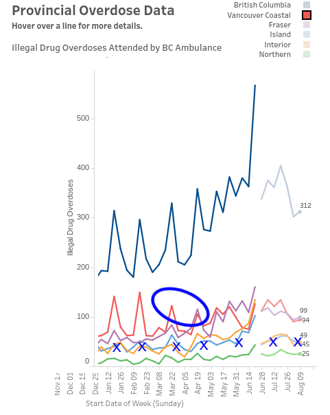 This graph is from the BCCDC – the blue line at the top represents 911 calls throughout the province and the five line nearer the bottom represent the five health regions.