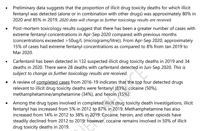 What does this mean? Well, there’s this pandemic that has disrupted everything, and these “extreme” concentrations indicate that while precursors are making it here, the production – in come cases – is not done by the same chemists or with the same equipment. It’s not as well made and there are residual precursors left in the mix, and the undiluted fent concentrations would take down an elephant or two. Yeah safe supply.