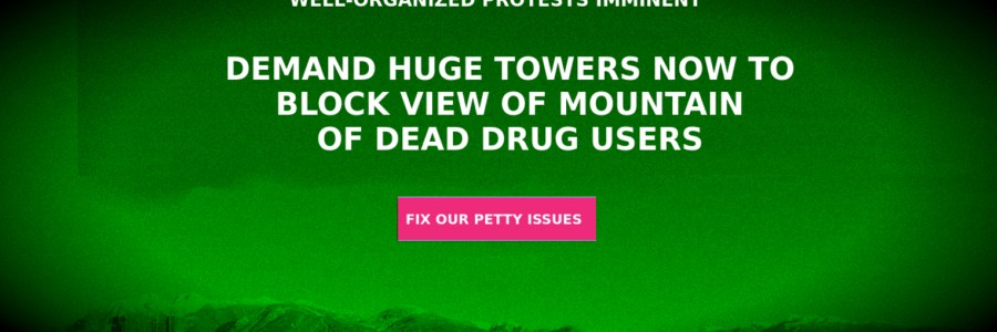 raise oiur property taxes, public demands… Read More Residents Demand Huge Towers When Unobstructed View Reveal Mountains To Be Gigantic Heap of Drug User Corpses